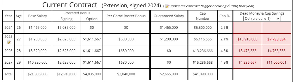 Love will need another career-season in 2025 because his cap hit jumps to $13.2 million in 2026, with $4.76 million in savings if the Seahawks opt to release or trade him next year. If Love takes another jump up in 2025 though, Seattle will likely be forced to restructure his contract (turning his $8.3 million base salary into a signing bonus that makes him cheaper in 2026 but more expensive in 2027) and that could lead to new extension talks — just two years after he re-upped.