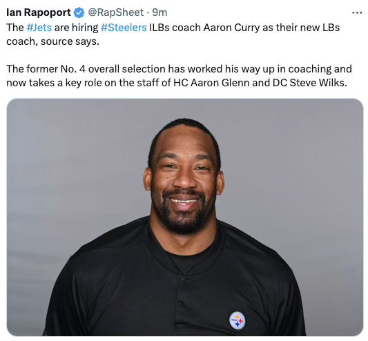 The most notable franchise draft bust since Rick Mirer, Aaron Curry continues to have a career in the NFL. He’s joining Aaron Glenn’s staff as the linebackers coach: