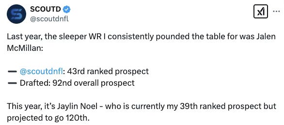 Love the idea of finding a WR in Rd 3 or Rd 4! My name was Xavier Restrepo if he lasts that long but Noel sounds like an option too, way cool!