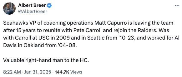 The Seahawks are losing VP of coaching operations Matt Capurro, as he’s clearly a close colleague to Pete Carroll since he immediately left for the Raiders once his former boss got a new job. Here’s a nugget from Brady Henderson: