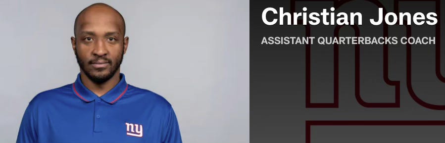 Per the Giants website, Jones has always worked closely with the team’s quarterbacks, including Daniel Jones, Drew Lock, Tommy DeVito, Davis Webb, Tyrod Taylor, and Tim Boyle.
