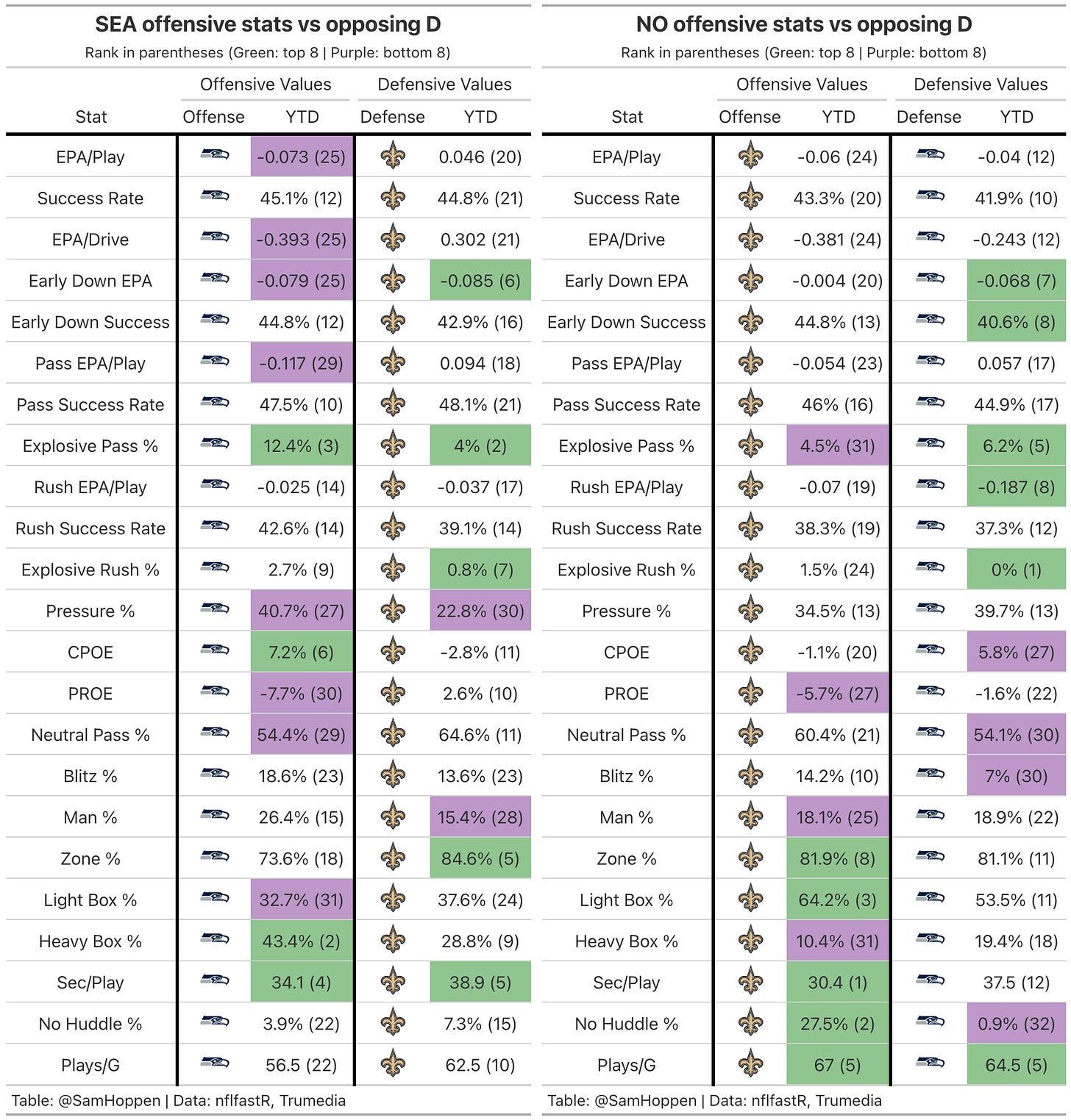 *Here is a game breakdown by Sam Hoppen on his Substack. You can see that the Saints have had a fairly bad offense (purple is bad):