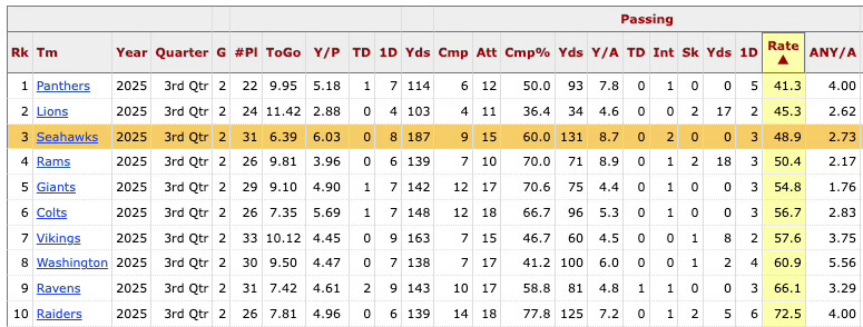The Seahawks have the third-lowest passer rating allowed in the third quarter so far: