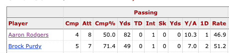 Here are Purdy and Rodgers’ final stats for the third quarter:
