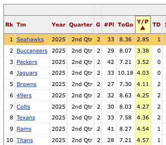 The Seahawks are allowing 2.85 yards per play in the second quarter, by far the lowest number in the NFL: