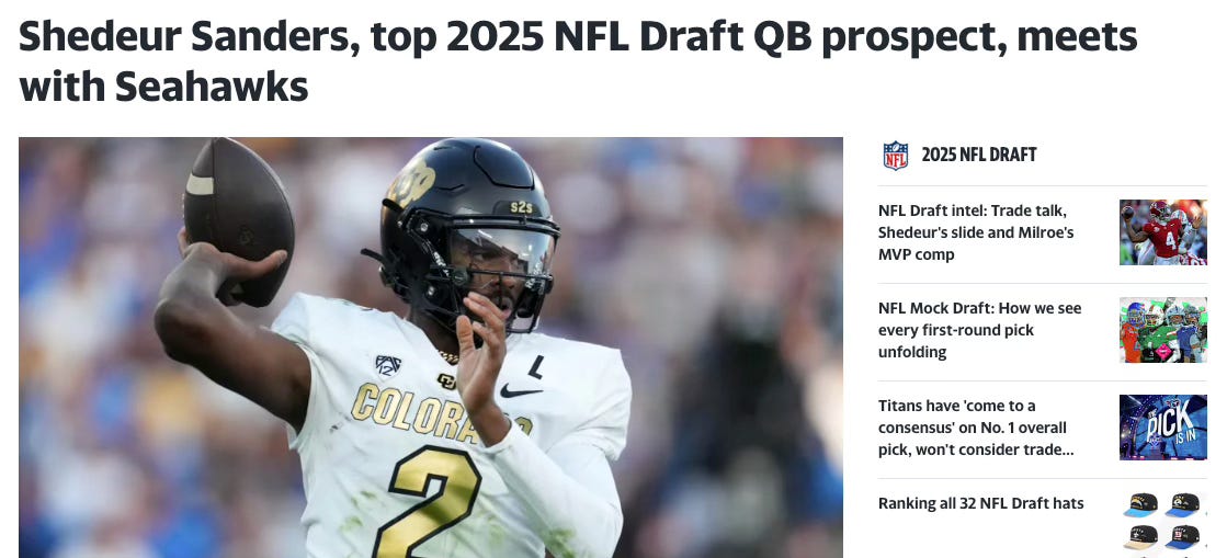 Meng Song of Football Guys has the Seahawks trading up with the Saints to pick QB Shedeur Sanders