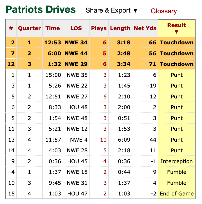 The one time they scored some points, against the Texans, this was the Patriots drive chart—and I think this is more telling than points: