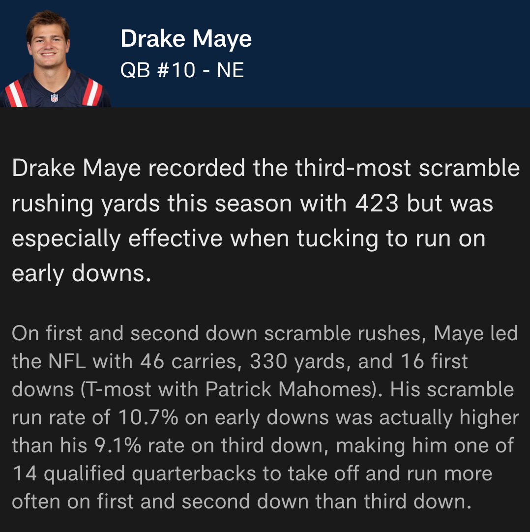 Look, Maye can run. He’s athletic. He can scramble. He can move his launch point and throw accurately on the run. He can beat you with his arm and his legs. Drake Maye IS a dual threat…but I think that aspect of his game has now been overrated BECAUSE New England’s supporting cast is so underwhelming that people have had to sort of create situations to be afraid of against the Patriots.