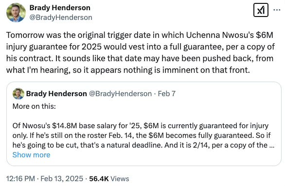 Maybe there’s a chance that Nwosu is on the trade block and Seattle is getting nibbles that both sides would like to see turn into a bite, but the least probable outcome is that he returns to the Seahawks and makes the $15 million he’s set to be paid in 2025. This is the only logical reason that Nwosu would agree to push back the date for his $6 million contract trigger: He has no leverage.