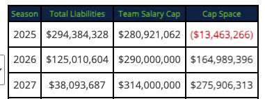 $231.1 million in liabilites, $49.8 million in projected 2025 cap space