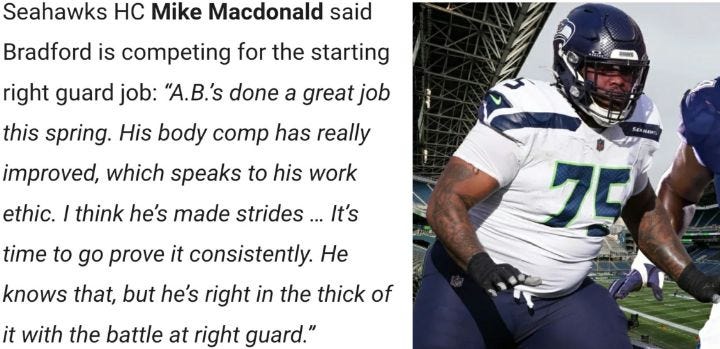 A motivated Anthony Bradford with an experienced OL coach in John Benton could potentially be Seattle’s best opportunity to get a right guard as good (or better) than Damien Lewis.