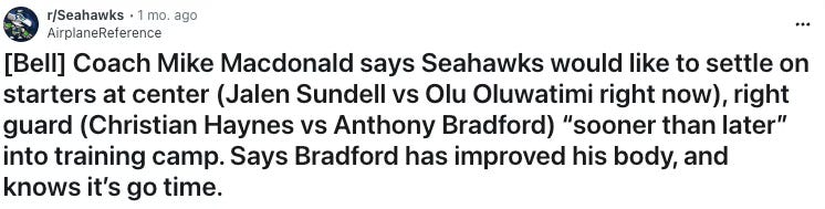 By the way, if you like Seahawks offensive line talk, please subscribe to Seaside Joe’s Regular Joes club for only $5 per month — camp starts in three days so NOW IS THE TIME! — and I can promise more of it, let’s just get a couple of new signups today: