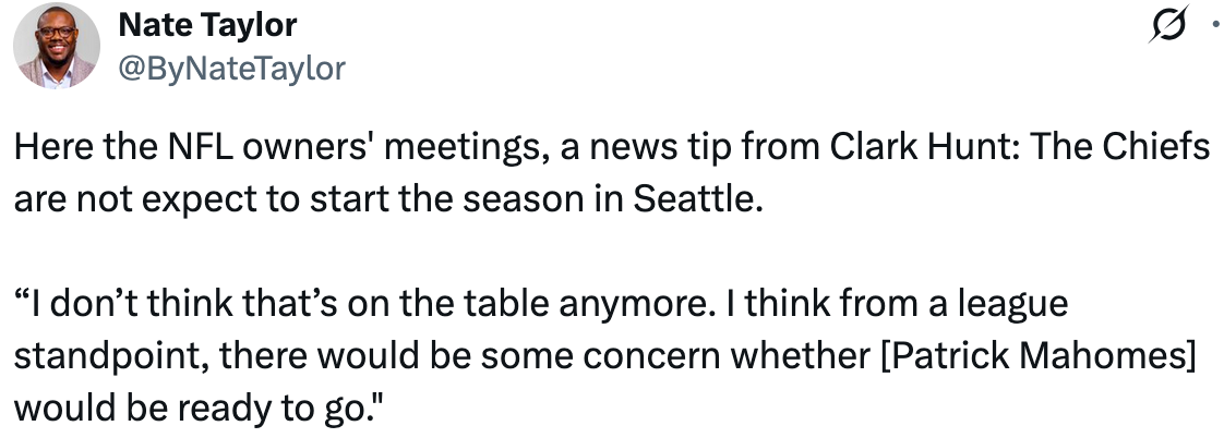 The Chiefs don’t expect to be selected for Week 1 because Patrick Mahomes may not be ready to return from his torn ACL by then, but Seattle-Kansas City must be one of the primetime games at some point.