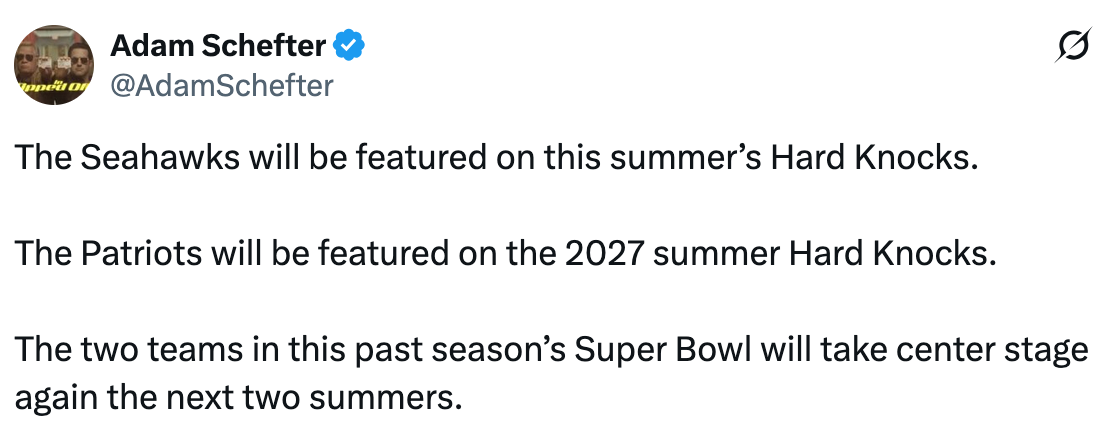 The Seahawks had never been selected by Hard Knocks before, often in part because Seattle is usually in the playoffs. I actually wrote a newsletter a year ago about why I felt the Seahawks would be the perfect team to select for 2025 Hard Knocks—which would have either given fans a preview of the next Super Bowl champions or (as many usually fear) derailed the season—and instead the NFL went with the Buffalo Bills.