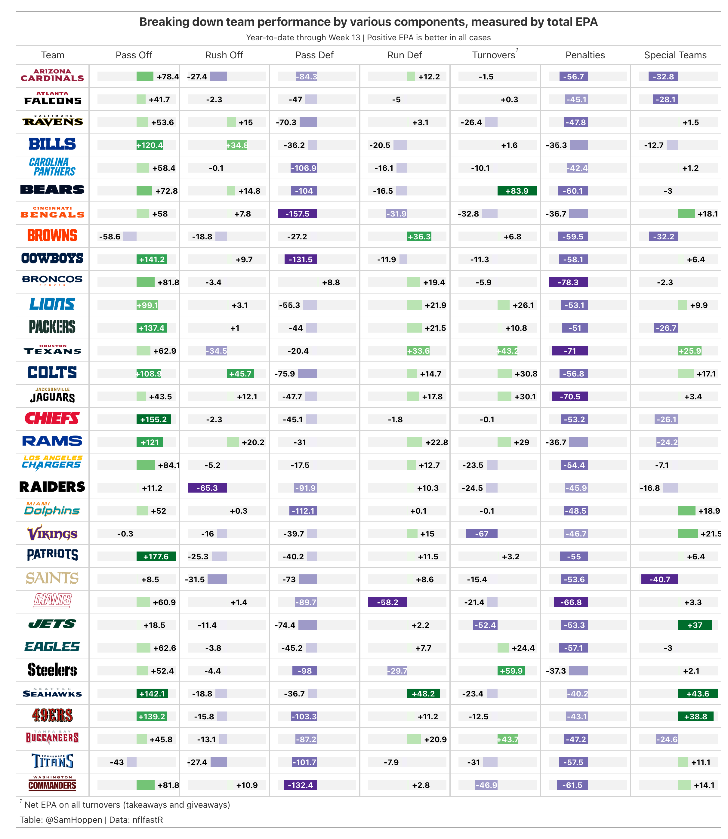 This is the image from Hoppen. I hope you can read it or click on it to expand it, but special teams is on the right and Green=Good. The Seahawks also rank third in passing offense and first in run defense: