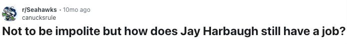 Harbaugh’s Seahawks career started from a disadvantageous position because fans liked Izzo (those who even knew of him) and didn’t like the Harbaugh family. Or at best, were skeptical of Jay Harbaugh’s qualifications as a coach who had only been given jobs by family members, including nine years working for his dad Jim at the University of Michigan.