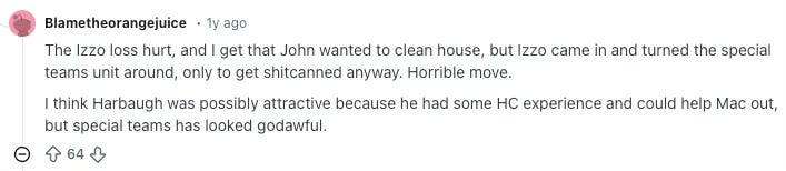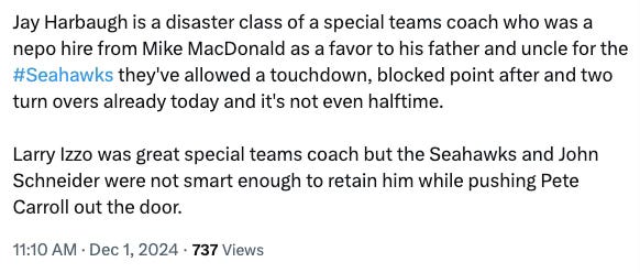 Fair enough, but the Seahawks were also in the process of overhauling 60-90% of the team after ousting Carroll for Mike Macdonald and John Schneider’s vision. Seattle had parted with a lot of key special teamers from the past, including Nick Bellore, and Harbaugh had to teach a whole new set of ideas to ingrain into the returning/new players.