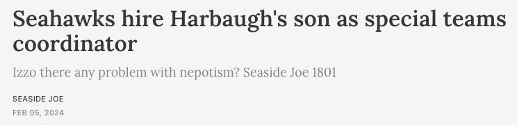 There is no question that nepotism is an advantage in coaching with no equal. Seattle’s staff includes both a Harbaugh and a Kubiak in two of the biggest roles under Mike Macdonald and previously Pete Carroll hired two of his sons with the Seahawks, both of whom currently have important roles on the Raiders.