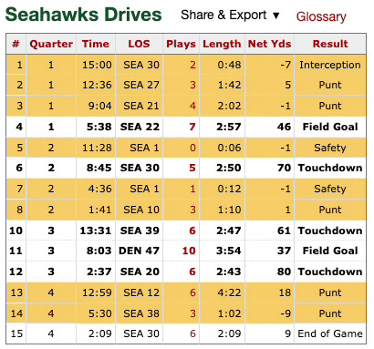 The Seahawks first three drives totaled -3 yards, two punts, and one turnover. Seattle then settled for a field goal after having a 1st-and-10 at Denver’s 35 (completion 0 yards, run 3 yards, incompletion). Then came the safety on Anthony Bradford’s holding penalty in the end zone, essentially meaning that the Seahawks first five drives were worth a total of +1 point, but it is more accurate to say -2 points because Geno’s interception netted a 35-yard field goal for the Broncos.