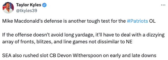 I know that the Seahawks stuffed Denver’s two running backs in Week 1, but I’m not sure how they’re going to hold up for the next 16 games. Nobody knows. I do think, however, that Stevenson is a better running back than anyone on the Broncos and I’m curious to find out how offensive coordinator Alex Van Pelt, formerly Nick Chubb’s OC in Cleveland, is able to help an offense with no passing threats (unless Drake Maye emerges this year) manage to move the ball on the ground this season.