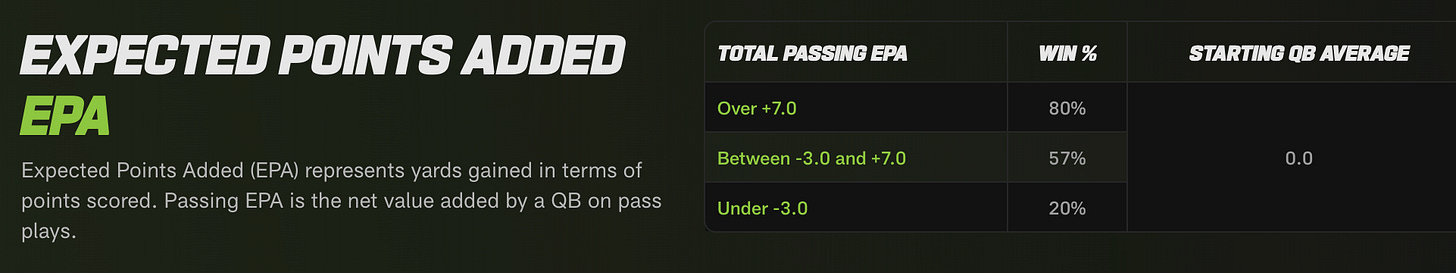 When a team gains +7 passing EPA in a game, they are 80% likely to win that game.