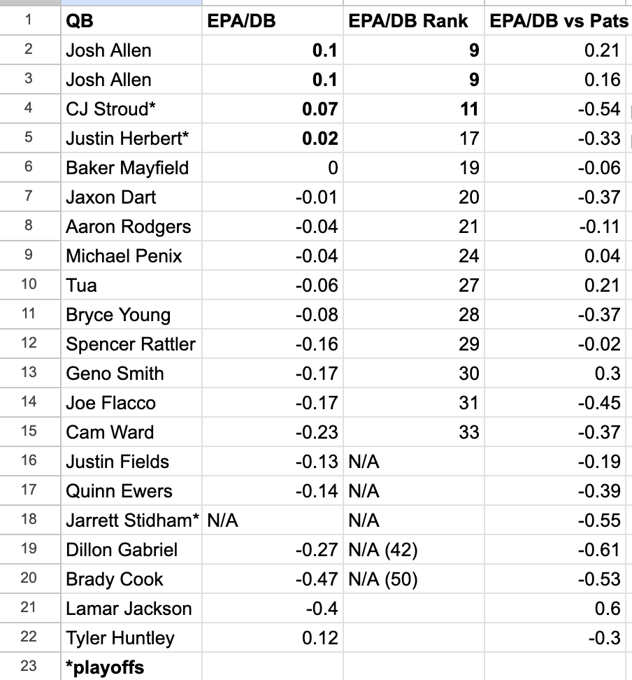 I tracked the 20 games that the Patriots have played and the 21 separate QB performances with at least 10 passes (Lamar/Huntley split time) and Josh Allen was the only QB in the top-10 of EPA per dropback at 9th overall.