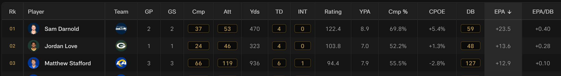 Darnold leads all playoff QBs with +23.5 EPA and +.40 EPA per dropback