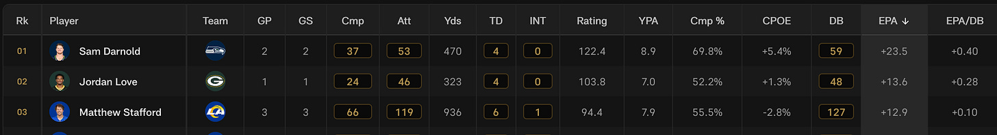 The Seahawks faced those two quarterbacks a total of six times, went 4-2, and held them to -10 (negative) EPA a total of three times. That includes four straight wins against them.