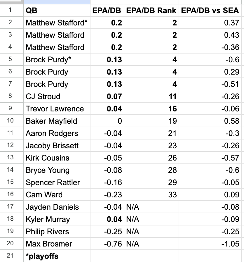 So obviously Maye is the highest-ranked QB that the Seahawks have faced this year because he’s number one overall. However, he’s not separated that much from Matthew Stafford (#2) or Brock Purdy (#4) in the same category.