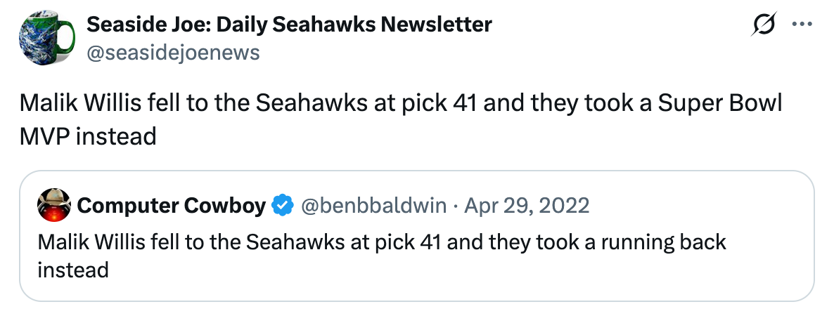 That’s just 10 off the dome. Oh yeah, traded Geno Smith (called a “terrible move”) and DK Metcalf.