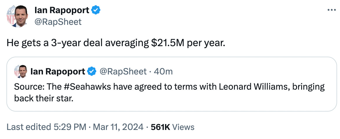 (It’s worth noting that while the Seahawks did give up a second and a fifth for Williams, re-signing him means that he won’t count in their compensatory pick formula for 2025, which you can read all about here. Had the Seahawks signed Williams in free agency, it could have cost them a mid-round pick that they might be getting back for Jordyn Brooks. So there is a minor offset there.)