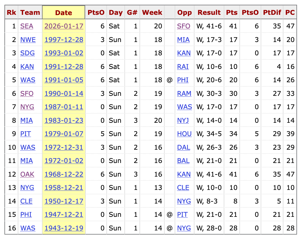 The 1968 Raiders and 2025 Seahawks are the only two teams to beat a division opponent by 35 points in a playoff game. Which is of course even stranger because in 1968 there were only two AFL divisions! (And 4 NFL divisions.) Remarkably, the Raiders would lose to Joe Namath’s Jets of destiny the following week.