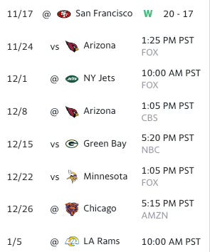 The Athletic’s current projection of an 11% chance to reach the postseason and a final record of 8-9, behind the Cardinals, Rams, and still behind the 49ers despite beating San Francisco, only feels “off” if the Seahawks play considerably worse or considerably better than they have so far. But the most likely rest-of-season scenario that would benefit Seattle’s playoff chances: