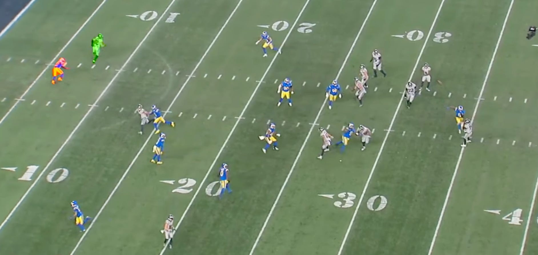 Post snap, all six of the threats look like they're actually coming. This tells Sam that the pre-snap plan was correct and he gets his eyes glued to JSN, waiting for him to win leverage. As soon as JSN makes the cut, Sam gets rid of the ball just before the defender in his face drills him. Unfortunately for Sam, the defensive tackle took a couple steps downfield and then peeled off into the throwing lane for an easy interception. This is called a simulated pressure. The Rams create the urgency of a blitz without actually bringing more guys.