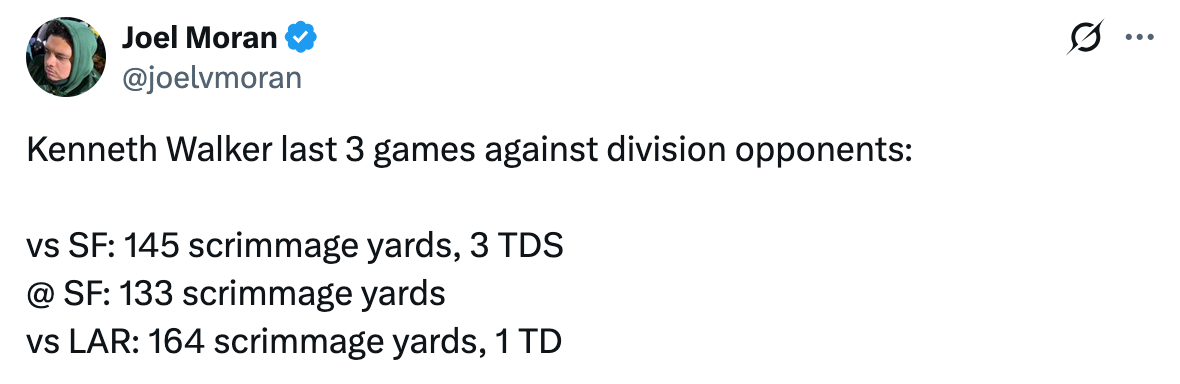 Months ago, I wrote a newsletter praising Seattle’s strategy to pair Walker and Zach Charbonnet for a long-term vision that would keep one or both running backs fresh for the playoffs. (Maybe one of Seaside’s sleuths out there can help me remember the title of that article, unless I’m thinking of this one about him being “the modern version of a great running back”.)