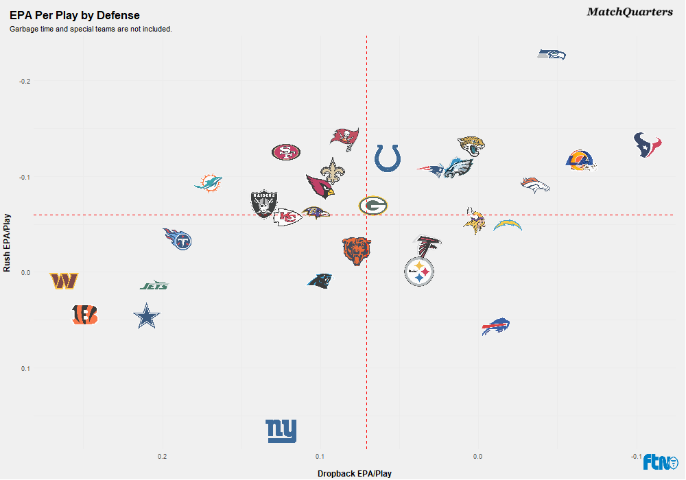 The Seahawks, Rams, and Texans are the only defenses that rank top-5 in Defensive DVOA, Pass Defense, and Run Defense.