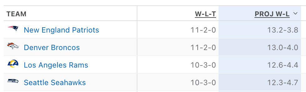But right now I’m just going to shrink the debate down to the four teams that have the most wins in the NFL this season: Seahawks, Rams, Broncos, and Patriots.