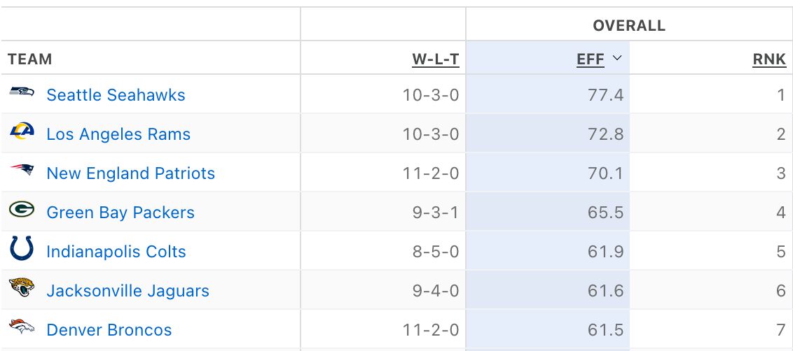 The Seahawks have the best special teams in the league, as they rank first in both EPA and on ESPN’s Efficiency* metric. The Rams might have one of the worst! They definitely have the worst in this group and 2 of their 3 losses were directly related to special teams mistakes.