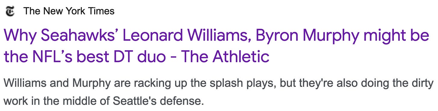 By getting 14 sacks from Leonard Williams and Byron Murphy, the Seahawks aren’t necessarily asking DeMarcus Lawrence and Uchenna Nwosu to lead them in sacks. They still have 5 and 6 respectively, plus they’re helping support the NFL’s best run defense. Is it the best front-7 in the NFL?