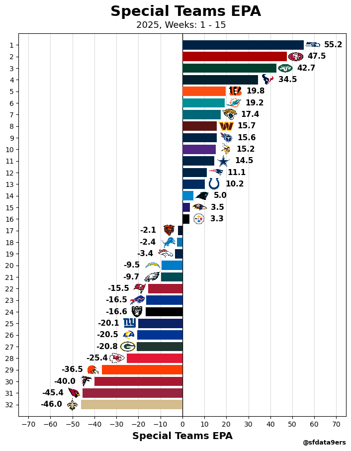 In Week 11, Seattle had a special teams EPA of +3.04, their fourth-best such performance of the season. Compare that to L.A.’s actual BEST special teams game of the season: +3.09.