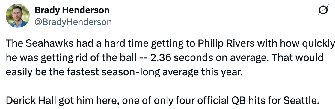 That being said, I do think Seattle’s offense could be described as a vanilla play action passing attack with a single unguardable threat paired with a bad rushing offense. It’s been said that the Seahawks only have a handful of passing concepts that work…they just work really well. Good defensive coordinators like Colts DC Lou Anarumo could be smart enough to slow them down considerably.