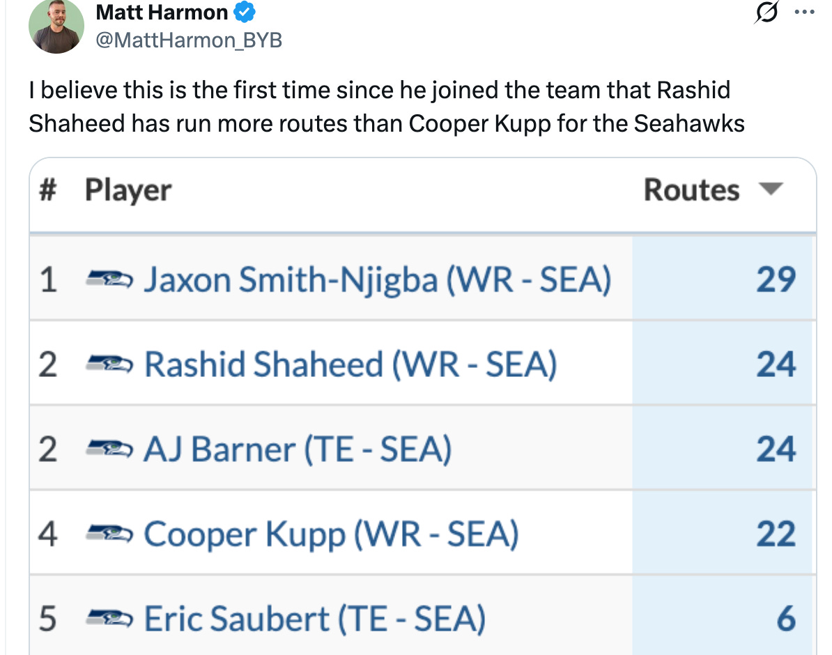 Now you’re probably saying to yourself, like I am, “that’s for the entire season though, what about recently?” and that’s a good question with fewer passing touchdowns of late. However, JSN isn’t showing signs of slowing down and Rashid Shaheed is speeding up, so the answer for who gets more targets moving forward may be that it’s the new guy and Tory Horton instead of Walker and Charbonnet.
