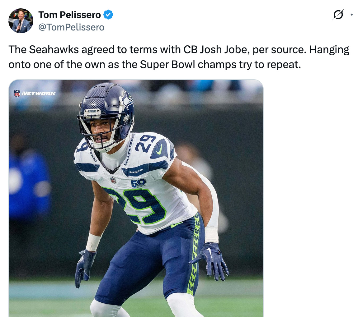 Jobe was the Seahawks free agent I listed atop my probable returning players based on his combination of talent and affordability, plus the likely departures of secondary players like Riq Woolen and Coby Bryant.