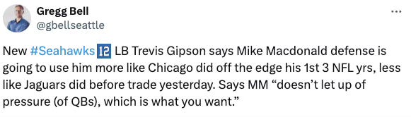 Were it not for Uchenna Nwosu’s injury in the final preseason game, perhaps Seattle would have never considered a trade for Gipson at this point of the year. However, the injury did happen and based on Schneider’s comments of having failed several attempts to acquire Gipson in the past, this move also feels inevitable.