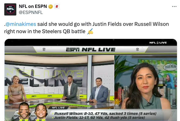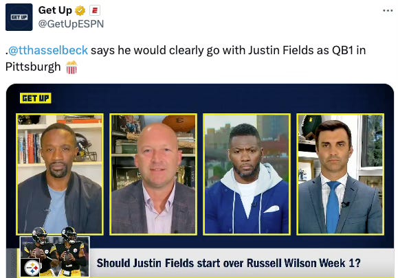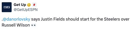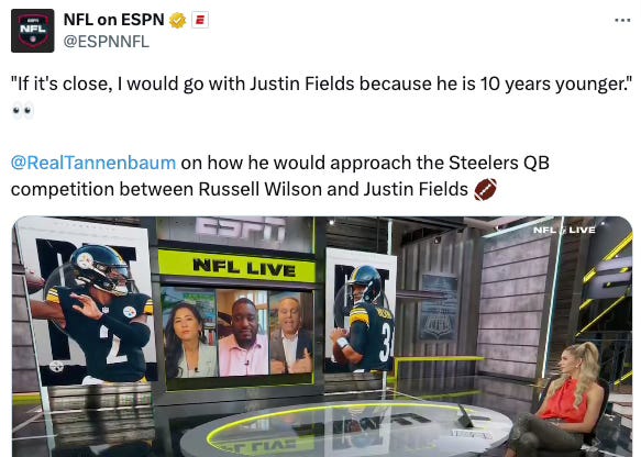 Now ESPN, and most of the NFL media landscape to be fair, has been putting out almost daily stories since Pittsburgh put Wilson and Fields in the same QB room that the Steelers would do a disservice to their fans by playing the better quarterback over the younger quarterback.