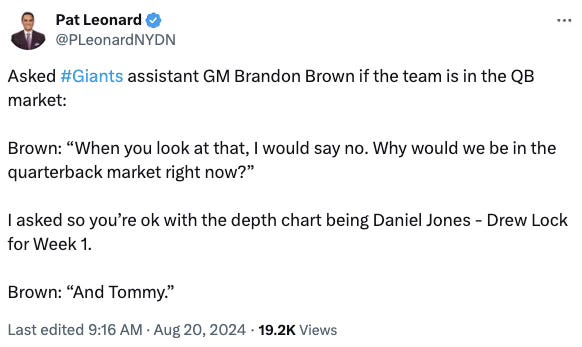 The Giants insist that they’re okay with Jones as the starter, Lock as the backup, and Tommy DeVito in third place. Assistant GM Brandon Brown, who is maybe being highlighted so much lately on Hard Knocks and in the news because the team wants to prop him up as a near-future successor to GM Joe Schoen, says that despite any struggles you see right now that the Giants feel this is part of the process of coming back from ACL surgery.