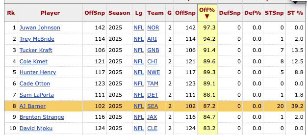 Maybe Barner will never have more than 500 receiving yards in a season, maybe he won’t even have more than 400. (He’s currently on pace for about 200.) Pairing him with Elijah Arroyo kind of reminds me of what Mike Macdonald’s former colleagues have in Baltimore with Mark Andrews and Isaiah Likely. But he is far, far more than “just” a blocking tight end.