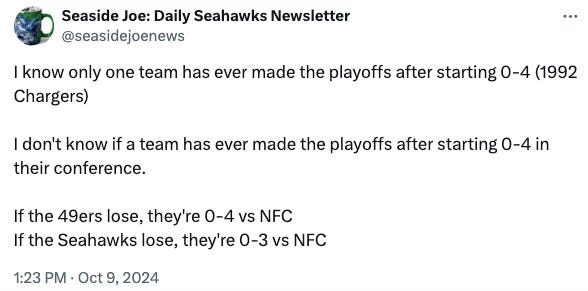 This may be an overreaction to the first five weeks of the 2024 NFL season, as this one-third of the season could be a lot different than the second one-third, or the third one-third. But the teams that don’t win the NFC West must now measure themselves against the teams don’t win the NFC North (Lions and Bears are current wild card teams and a combined 5-1 in the NFC, Packers are 3-2), the NFC South (Bucs are 3-1 in conference and playing underrated football), or the NFC East (not only are Cowboys, Eagles, and Moons all formidable, the Seahawks now have a head-to-head loss to the Giants).