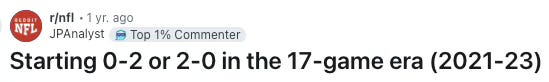 In the 17-game era, only 2-of-21 teams made the playoffs after starting 0-2 from 2021-2023. Both teams won their division to make the playoffs, including the 10-7 Texans in 2023, the same record that the Seahawks had last year and missed the playoffs. But that number got a little bit better in 2024, as three teams started 0-2 and made the playoffs: