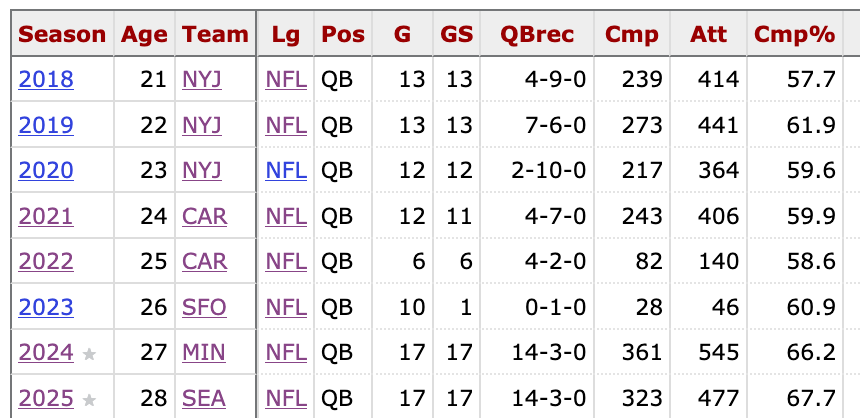 The most dramatic improvement in Darnold’s stats between his first six seasons and his last two seasons is not turnovers, it’s the completion rate.